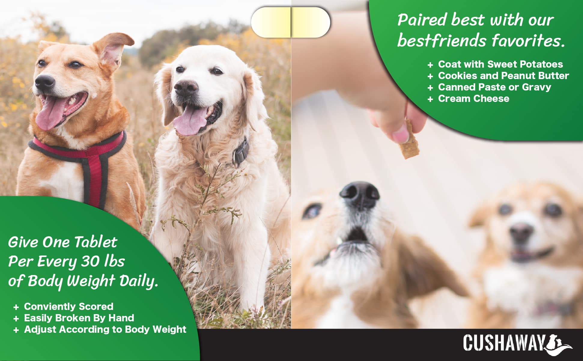 The recommended dosage of the CushAway nutritional supplement is one tablet per 30 pounds of the dog’s body weight. The tablets are conveniently scored and can be broken by hand in order to better adjust the dosage for your dog’s weight. Because the product contains melatonin, it is recommended that it be administered in the evening before meals